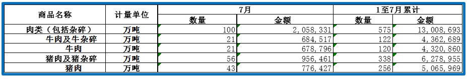 海关数据显示,7月份猪肉的进口量达43万吨,创下了中国猪肉月进口量的新记录。1月至7月的猪肉进口量达256万吨,较去年同期增长了一倍以上(去年同期进口量为100万吨)。尽管新的检查措施使港口清关速度略有放缓,但7月份的猪肉进口数据较6月仍有7.5%的环比提升。数据还显示,7月份包括内脏在内的猪肉进口量为56万吨,同比增长87.1%。今年截至7月底的猪肉及猪杂总进口量已达到338万吨,同比增长98.2%。